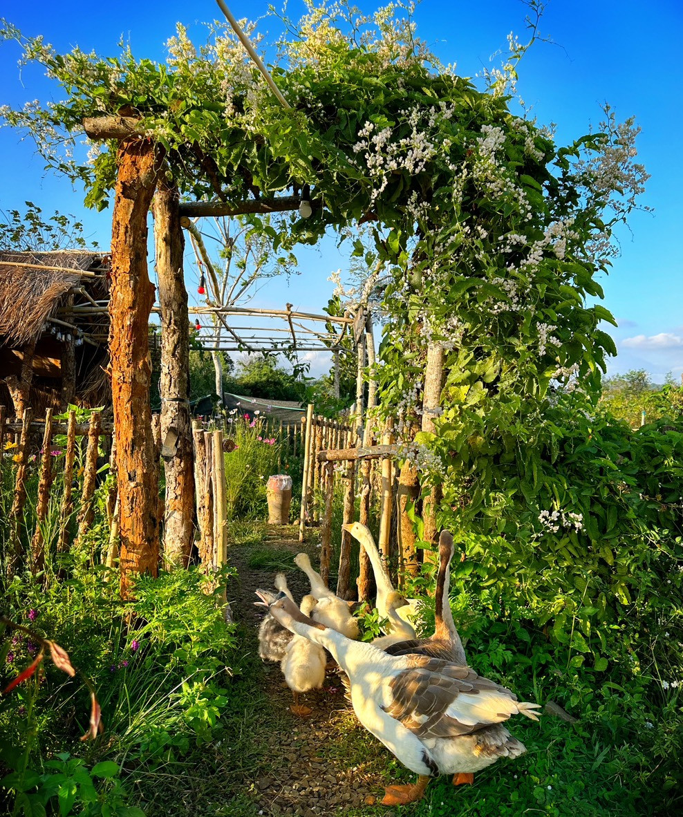 Mảnh đất của gia đình chị rộng 3.000m2, trong đó 1.000m2 được dành làm vườn và nhà ở. Anh chị cải tạo lại căn nhà và bếp cũ kỹ sẵn có trên khu đất, tự tay sơn sửa từng hạng mục, vừa tiết kiệm chi phí, vừa được thoải mái sáng tạo theo sở thích bản thân.