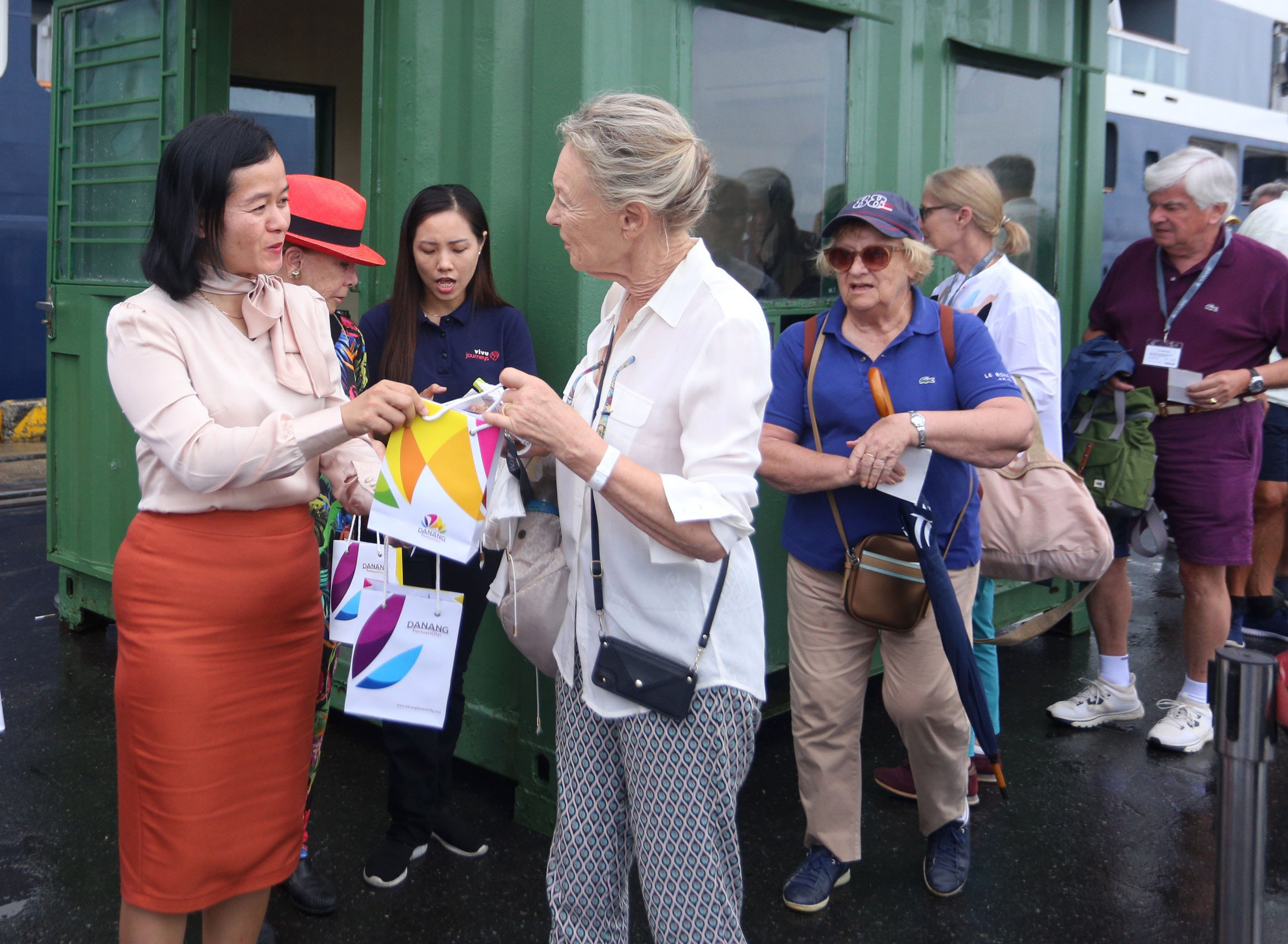 Tàu du lịch 5 sao đưa hơn 100 khách quốc tế đến với Đà Nẵng. Họ tới từ các quốc gia như Pháp, Mỹ, Đức, Bỉ, Thụy Sĩ… Trong 1 ngày lưu lại tại Đà Nẵng, các du khách sẽ thưởng lãm, chụp ảnh lưu niệm tại các địa điểm du lịch trên địa bàn.