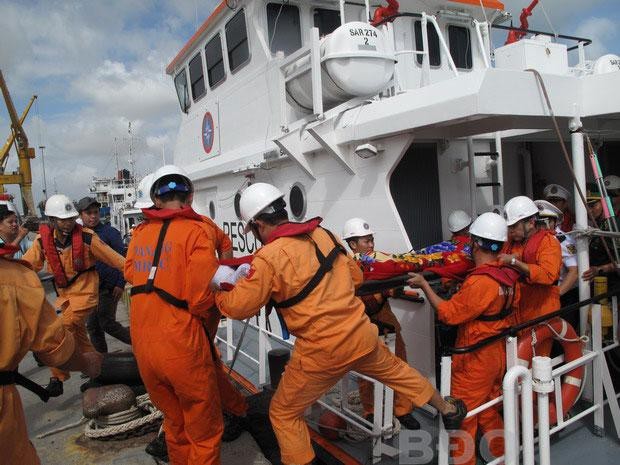 | Tàu SAR 274 cập bờ đưa thi thể thuyền trưởng Lường Xuân Hạnh vào bờ |