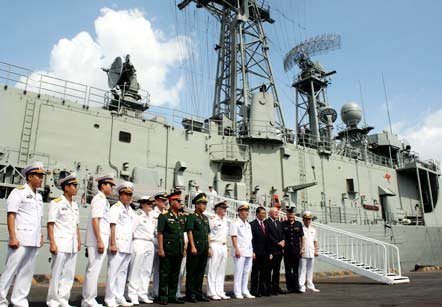 Các sỹ quan, chỉ huy tàu HMAS Sydney 03 chụp ảnh lưu niệm cùng với đại diện hải quân Việt Nam, Tổng lãnh sự Australia tại TP.HCM và đại diện Sở Ngoại vụ TP.HCM.