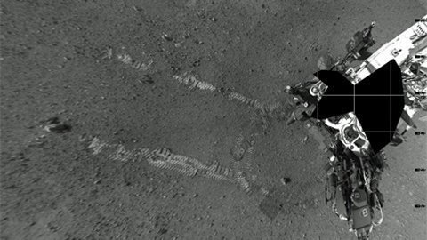 Trong một bức ảnh toàn cảnh đen trắng do hệ thống camera dẫn đường của tàu chụp, người ta có thể nhìn rõ vết lốp của Curiosity trên nền đất sao Hỏa, cùng với đó là dấu vết do tên lửa hạ cánh của tàu để lại khi tàu hạ cánh cách đây 2 tuần.
