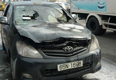 | Đám cháy đã thiêu rụi gần như toàn bộ chiếc xe, phần kính bị nứt vụn (Ảnh: NLĐO) |