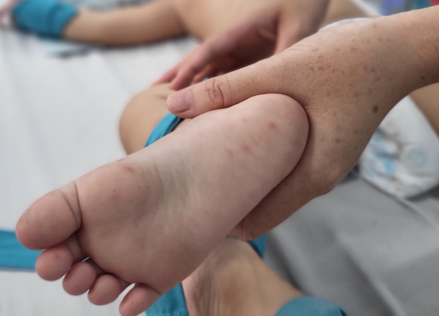 Khai thác bệnh sử ghi nhận trẻ sốt nhẹ và nổi hồng ban 3 ngày. Bác sĩ phòng khám tư chẩn đoán em bị tay chân miệng độ 1. Một ngày sau, trẻ sốt cao, khó thở, suy hô hấp và chuyển vào viện trong tình trạng tím tái, ngưng thở, truỵ tim mạch.