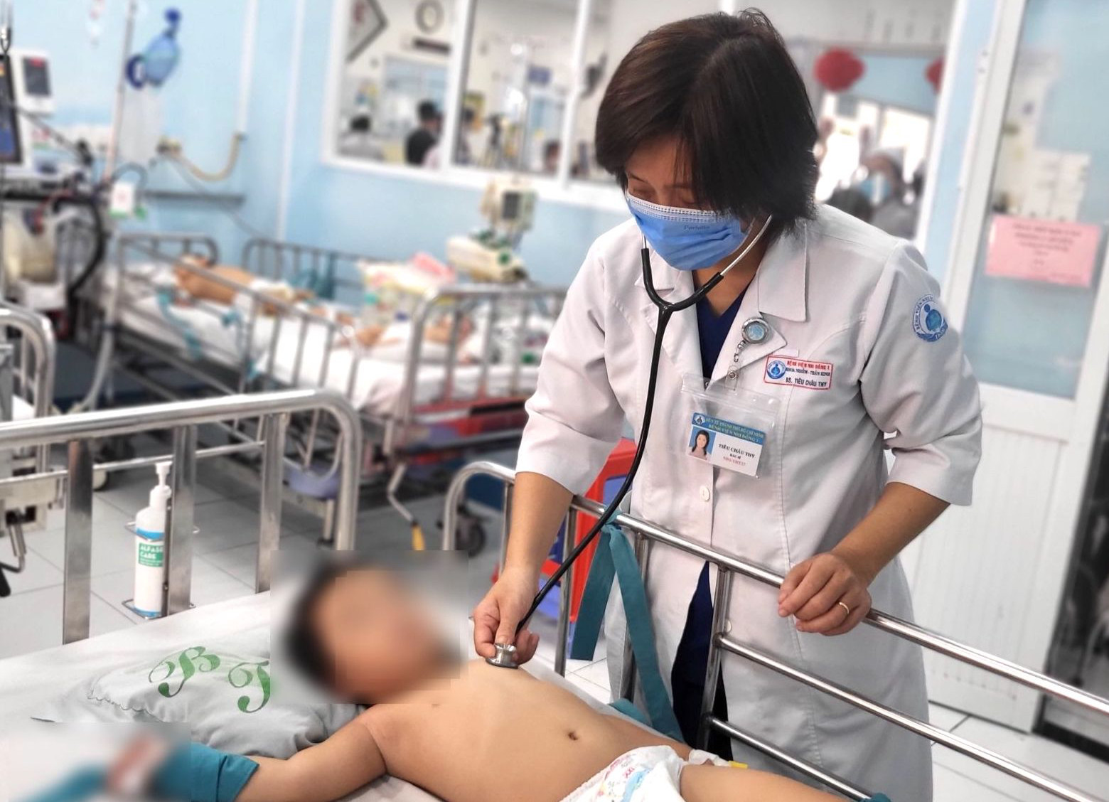 Bác sĩ Phạm Văn Quang thăm khám cho trẻ tay chân miệng nặng. Ảnh: GL.