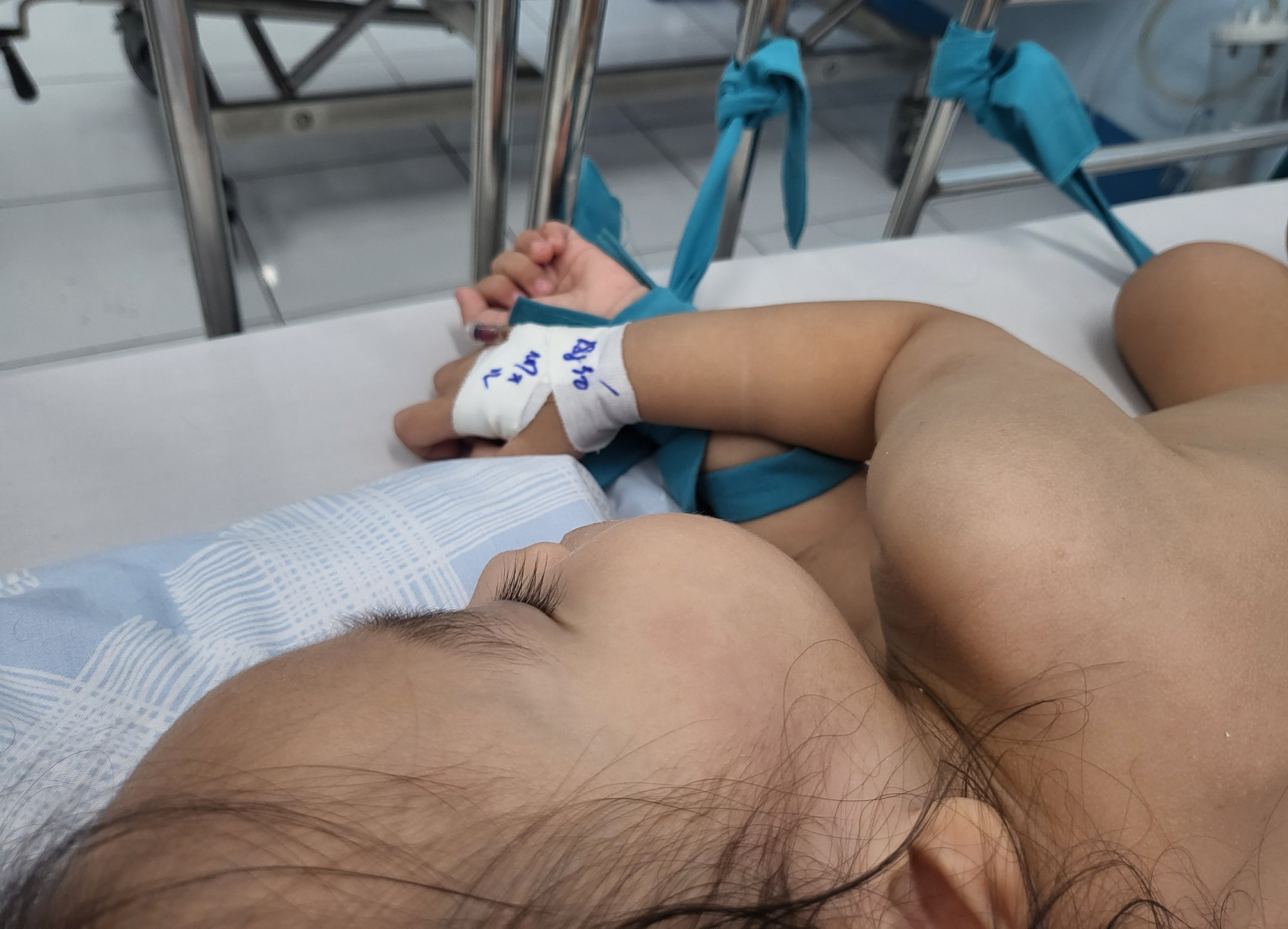 Tại Khoa Cấp cứu, bác sĩ đặt nội khí quản giúp thở, chích tủy xương truyền thuốc. Chẩn đoán lúc này là tay chân miệng độ 4, nguy kịch. Khi chuyển lên Khoa Hồi sức tích cực Chống độc, bé lập tức được chỉ định lọc máu. Đây là phương án cuối cùng.