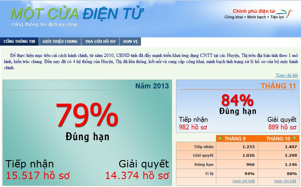 Theo số liệu được trích xuất từ Hệ thống một cửa điện tử của tỉnh, bộ phận Một cửa của các sở, ban, ngành của tỉnh và UBND cấp huyện đã tiếp nhận tổng cộng 44.307 hồ sơ, trong đó có 36.174 hồ sơ (đạt tỷ lệ 81,65%) đã giải quyết đúng hạn.