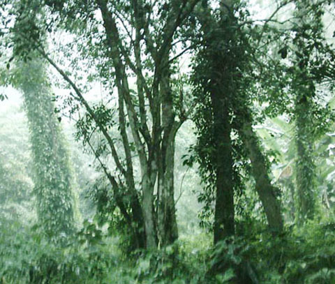 ngang những cây cổ thụ hai người ôm, yên bình trong tiếng chim hót, tiếng gió