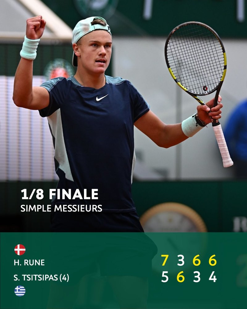 Holger Noedskov Rune trở thành người Đan Mạch đầu tiên lọt vào vòng tứ kết đơn nam ở một giải Grand Slam trong kỷ nguyên mở sau khi đánh bại Stefanos Tsitsipas với tỷ số 7-5, 3-6, 6-3, 6-4 ở vòng 4 Roland Garros.