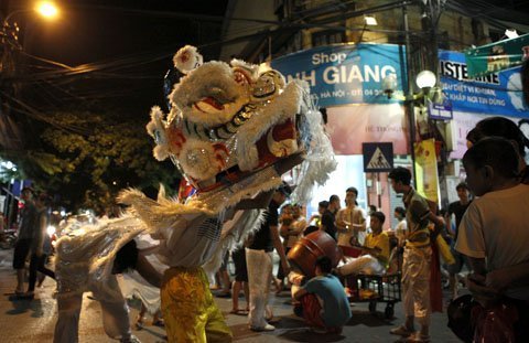 Múa lân trên phố Hàng Mã - Hà Nội.