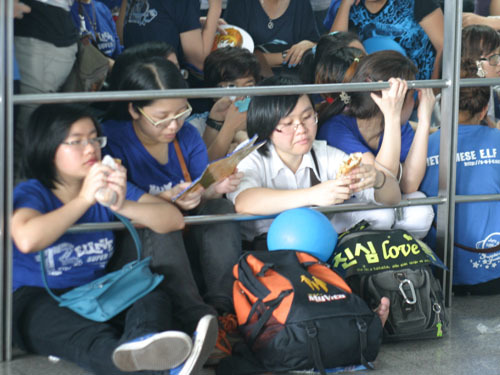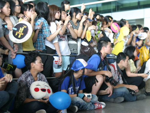 Hàng nghìn bạn trẻ ngồi trực ở sân bay Tân Sơn Nhất từ tờ mờ sáng để chờ thần tượng (Ảnh Nguoilaodong)