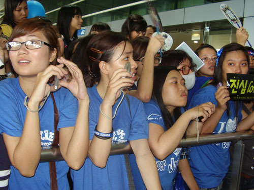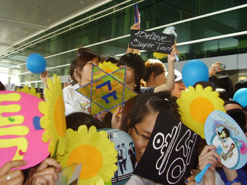 Đến gần giờ hạ cánh của chuyến bay số VN939 ICN – SGN mang 4 chàng trai của Supper Junior đến TPHCM, hàng ngàn fan đã đứng đầy hai bên cổng ra của ga quốc tế sân bay Tân Sơn Nhất. Những chiếc áo màu xanh, băng rôn, quạt, khăn… được các bạn trẻ tung lên để chào đón thần tượng.
