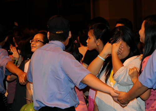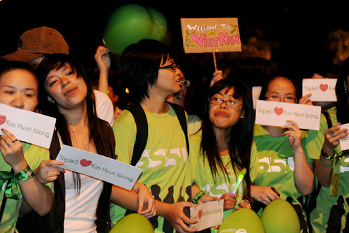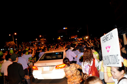 Khoảng 23h15, hai chiếc xe mô tô hộ tống mỹ nam Kim Hyun Joong lao nhanh ra cửa. Tiếng reo hò của fan lúc này trở nên náo loạn thật sự, và hàng rào bảo vệ không còn ý nghĩa, khi các fan ào về dòng xe có thần tượng của mình.