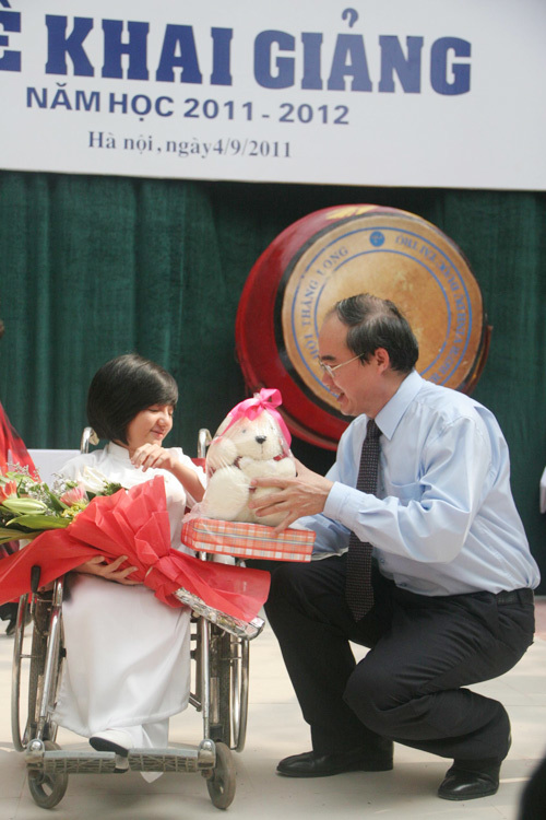 Nữ sinh nhận quà từ Phó thủ tướng Nguyễn Thiện Nhân (Ảnh: BĐVN) |