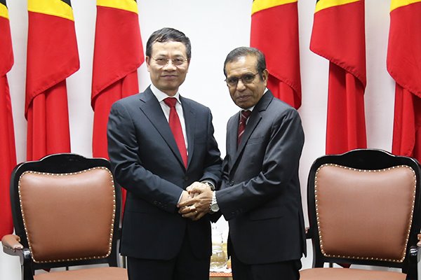 Bộ trưởng TT&TT Nguyễn Mạnh Hùng đến chào Thủ tướng Timor Leste Taur Matan Ruak. Ảnh theo MIC |