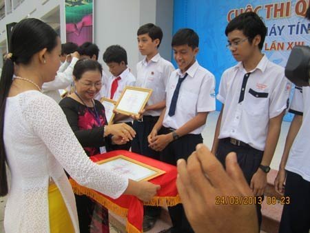 | Bà Nguyễn Thu Hà, PGĐ sở GDĐT tỉnh Đồng Tháp trao giải cho các thí sinh đoạt giải tại điểm thi Đồng Tháp |