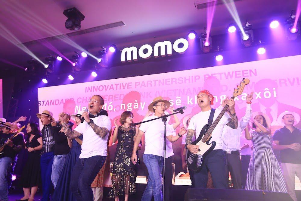 Những lãnh đạo cao cấp của MoMo "quẩy" trên sân khấu. |