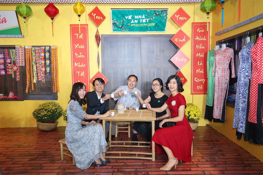 Oppo, hãng smartphone có thị phần lớn thứ hai tại Việt Nam, cũng có tiệc cuối năm ở một trung tâm tổ chức sự kiện sang trọng bậc nhất ở TP.HCM. Chủ đề tiệc năm nay của Oppo là "Tết xưa dẫu khác Tết nay, gia đình vẫn mãi là nơi quay về". "Nhà" trong trường hợp này vừa là Oppo Việt Nam - ngôi nhà chung của mọi người, và nghĩa thứ hai là gia đình của nhân viên.