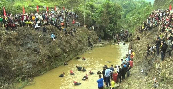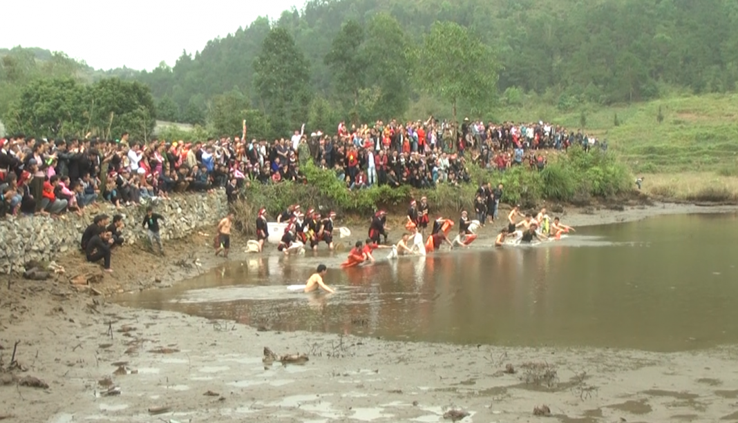 Trước ngày hội bà con trong bản đã cho bớt nước ở hồ, để chỉ ngập đến tầm nửa người, thuận tiện cho bắt cá có thể lội xuống.