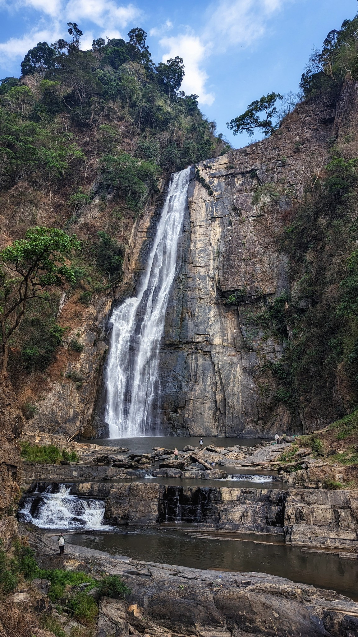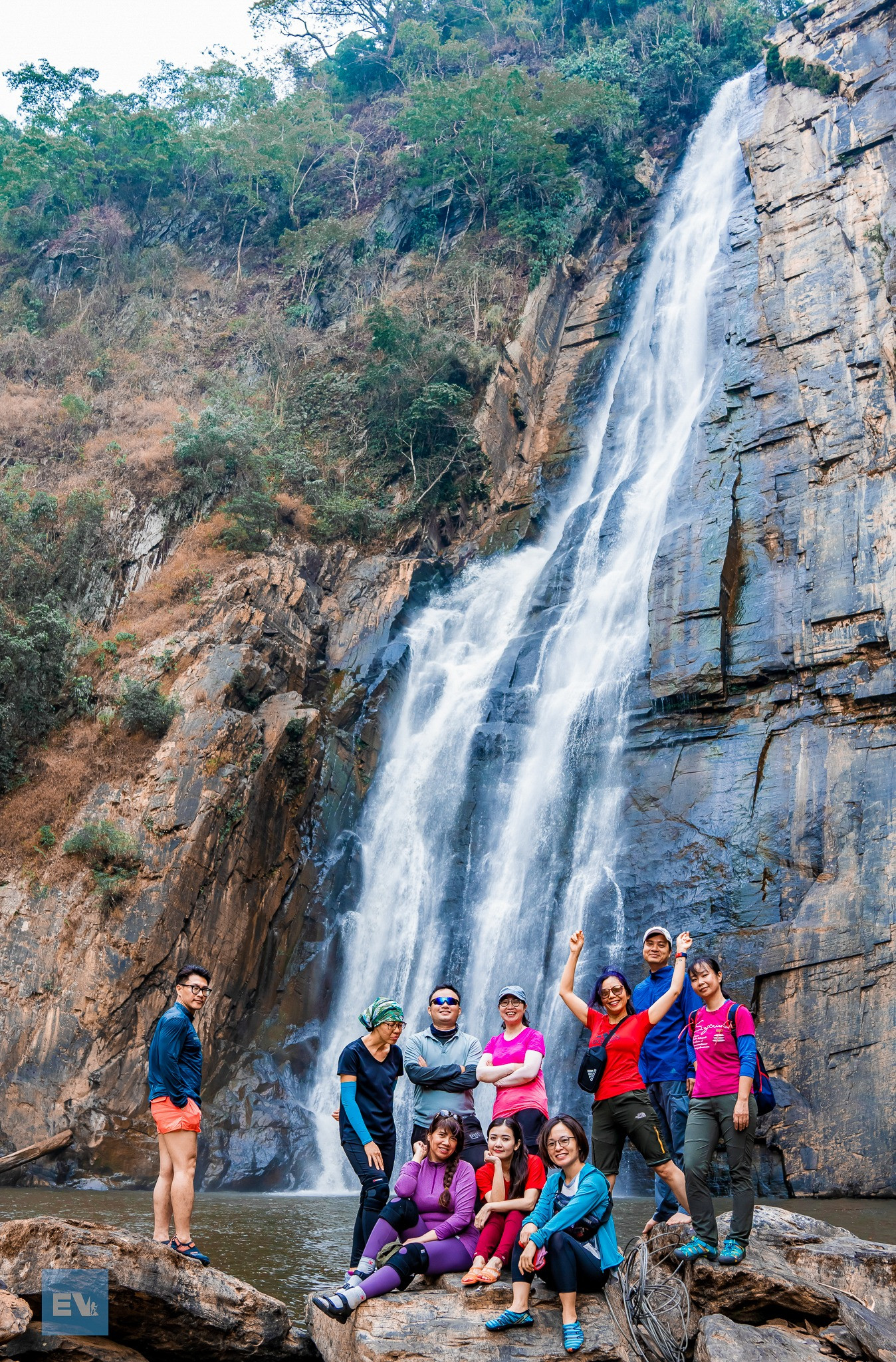 Vượt qua những con dốc, du khách sẽ bắt đầu nghe tiếng nước đổ. Dòng thác hùng vỹ nằm dựng đứng, nước cuồn cuộn đổ xuống tạo nên âm thanh vang vọng giữa mênh mông núi rừng.