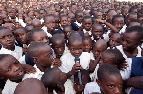 Những học sinh này đang tập trung trong 1 sân trường ở thành phố Lira (Uganda) vào 1 buổi sáng; rất nhiều trong số chúng là trẻ mồ côi do mất người thân trong các cuộc chiến tranh. Đất nước này hiện có khoảng 34 triệu người, và một nửa trong số này là trẻ em dưới 15 tuổi.