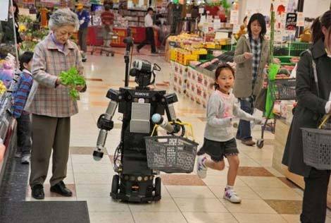 Một robot biết trò chuyện đang giúp đỡ một phụ nữ 69 tuổi đi siêu thị. Đây là sản phẩm thử nghiệm của các nhà nghiên cứu thuộc công ty Keihanna Science. Với 29 triệu người cao tuổi – chiếm khoảng 23% dân số đất nước – dân số nước Nhật đang ngày một già đi khi số người già vượt hơn hẳn số người trẻ. Tình trạng dân số già này đặt ra một lo ngại mà trước đây chưa từng có, đó là ai, hay cái gì sẽ chăm sóc và hỗ trợ cho những người cao tuổi trong những năm sắp tới.