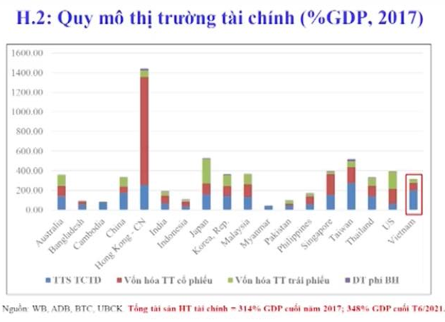 Bên cạnh đó, ổn định kinh tế vĩ mô gặp nhiều thách thức, đặc biệt áp lực lạm phát gia tăng cũng ảnh hưởng mạnh đến thị trường tài chính. Quy mô và mức độ phát triển của hệ thống tài chính Việt Nam ngày càng được cải thiện, nhưng vẫn còn hạn chế so với các nước trong khu vực. Tổng tài sản của các định chế tài chính năm 2021 (bao gồm các tổ chức tín dụng, doanh nghiệp bảo hiểm, công ty chứng khoán và công ty quản lý quỹ) tăng 10,4% (năm 2020 tăng 12,3%), tương đương 189,3% GDP. Ngoài ra, khu vực ngân hàng đối mặt nhiều khó khăn, rủi ro; thị trường vốn còn nhiều hạn chế. Việc thu hút dòng vốn nước ngoài vào thị trường còn nhiều thách thức do các tiêu chí nâng hạng thị trường chậm cải thiện. Thị trường trái phiếu doanh nghiệp (TPDN) mất cân đối, còn nhiều rủi ro. Phát hành chủ yếu là riêng lẻ, tập trung vào các ngành bất động sản, ngân hàng.