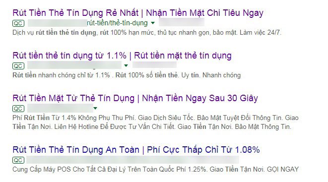 Theo tìm hiểu của ICTnews, hàng loạt trang web như rutthe…com, ruttien24…com, ruttienthetindung…com… đều quảng cáo sở hữu mạng lưới hỗ trợ rút tiền mặt từ thẻ tín dụng tại Hà Nội, TP.HCM, Đà Nẵng…, có thể rút tiền được hầu hết thẻ tín dụng mở tại các ngân hàng.