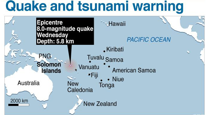 Một trận động đất cường độ 8 độ richter đã xảy ra tại gần quần đảo Solomon và gây nên sóng thần với khả năng có thể tác động tới bờ biển của nhiều khu vực trên Thái Bình Dương.