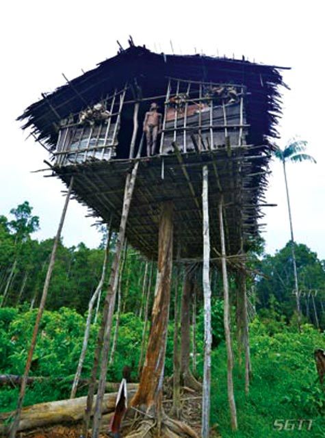 Ngày thứ ba của chặng hành trình vượt đầm lầy, chúng tôi đi sâu vào khu vực Lion. Chủ nhân căn nhà trên cây cao gần 20m – Lion mời chúng tôi nghỉ đêm ngay chính trên ngôi nhà cao của mình. Dù đã cùng sống với người Koroway trên những ngôi nhà này từ những đêm đầu vào rừng, chúng tôi vẫn không khỏi thót tim khi nhiều lần có gió thổi hay bước chân người đi lại, ngôi nhà lại lắc lư, rung rinh. Lion giải thích: “Tổ tiên chúng tôi ở nhà trên cây để tránh thú, tránh kẻ thù, cha tôi đã dạy cho tất cả các anh em chúng tôi cách làm nhà trên cây ngay từ thuở bé”. Người Koroway có những thói quen rất đặc biệt, phụ nữ không bao giờ ra khỏi ngôi nhà mà không mặc váy cỏ, đàn ông không bao giờ ra khỏi nhà mà không mang theo cung tên. Đàn ông Koroway được xem là những thợ săn thiện nghệ nhất ở miền đầm lầy nam Irian Jaya. Họ biết lặn xuống suối bắt cá, bắn những loài thú trong rừng để làm thức ăn.