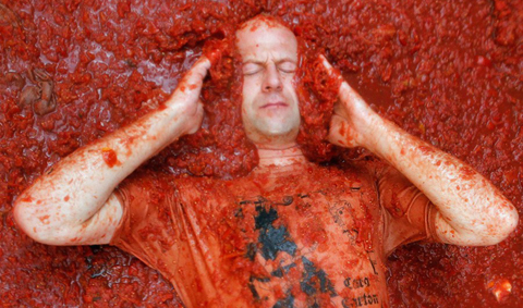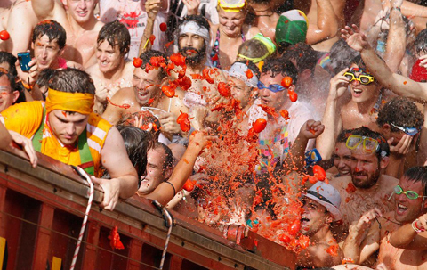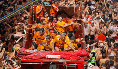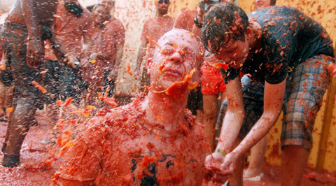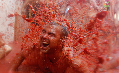 Cả thị trấn Bunol ở phía đông Tây Ban Nha chìm ngập trong màu đỏ khi hàng chục nghìn người dùng 120 tấn cà chua chín để làm "vũ khí" trong lễ hội ném cà chua La Tomatina hàng năm.