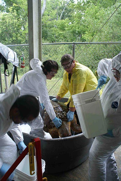 TS Brian Stacy đang làm sạch dầu bám trên cơ thể rùa Kemp’s Ridley. Các