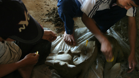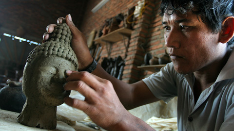 Một nghệ nhân trẻ của làng đang nặn một tác phẩm
