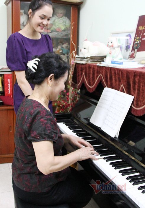 Hoàng Anh chăm chú đứng nghe mẹ chơi đàn ở phòng khách