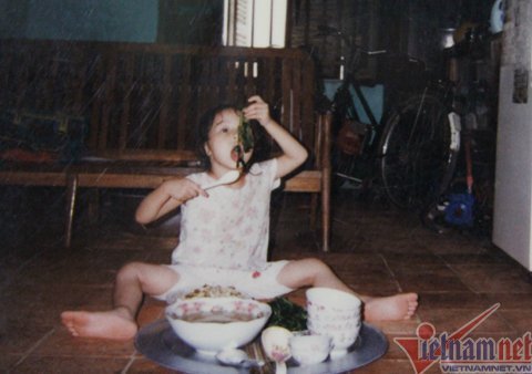 Bức ảnh "nghịch ngợm" ăn vụng rau muống của Hoàng Anh khi còn bé.