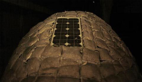 mặt trời đặt trên nóc nhà để tạo điện. Các bánh xe ở đáy nhà giúp công trình này