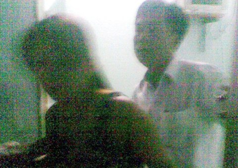 Ông Mộng bước ra khỏi phòng trọ cùng với vợ của anh D. thì bị người dân ghi hình. |