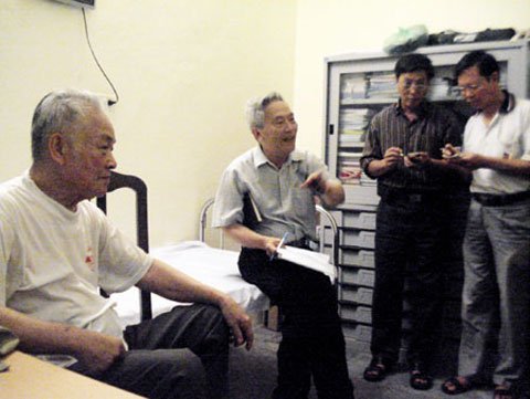 Ông Long (người ngoài cùng bên trái) chữa bệnh trước sự kiểm nghiệm của các nhà