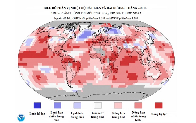 Nhiệt độ trung bình toàn cầu trên bề mặt đất và đại dương trên toàn cầu trong tháng 7/2015 cao hơn ngưỡng trung bình tháng Bảy thế kỷ XX 0,81 độ. Đây cũng là mức nhiệt độ hàng tháng cao kỷ lục đo được trong suốt giai đoạn từ 1880 - 2015, khi cao hơn các tháng khác tới 16,61 độ C, vượt qua mức kỷ lục đã thiết lập vào 1998 khoảng 0,08 độ C.