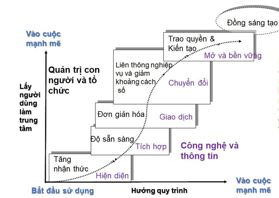 Minh chứng cho quan điểm của mình, chuyên gia Nguyễn Thế Trung viện dẫn, kết quả nghiên cứu 20 năm về Chính phủ điện tử tại các nước cho thấy mô hình trưởng thành của Chính phủ điện tử có sự đồng hành từ phía quản trị công và phía CNTT.