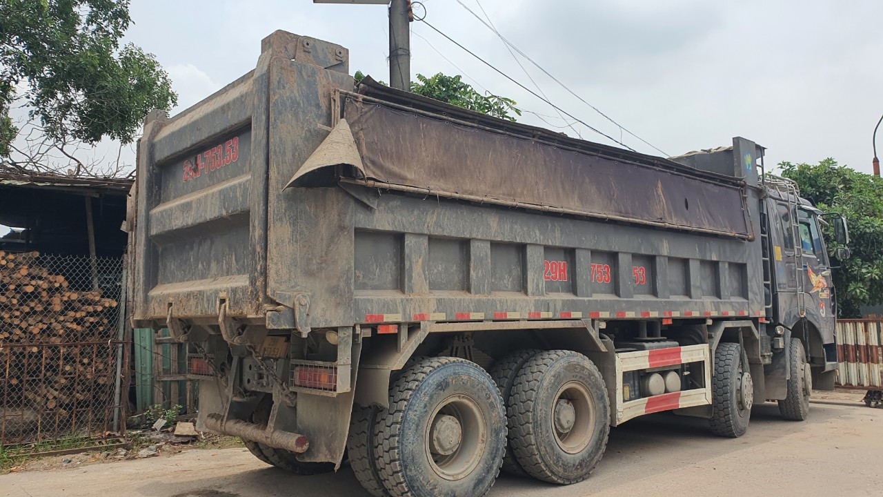 Xe có che chắn bằng bạt, bên trên là hai tấm đậy bằng sắt được hàn cố định với thành xe tuy nhiên vẫn chưa đủ để đảm bảo đất đá không rơi ra đường trong quá trình vận chuyển.