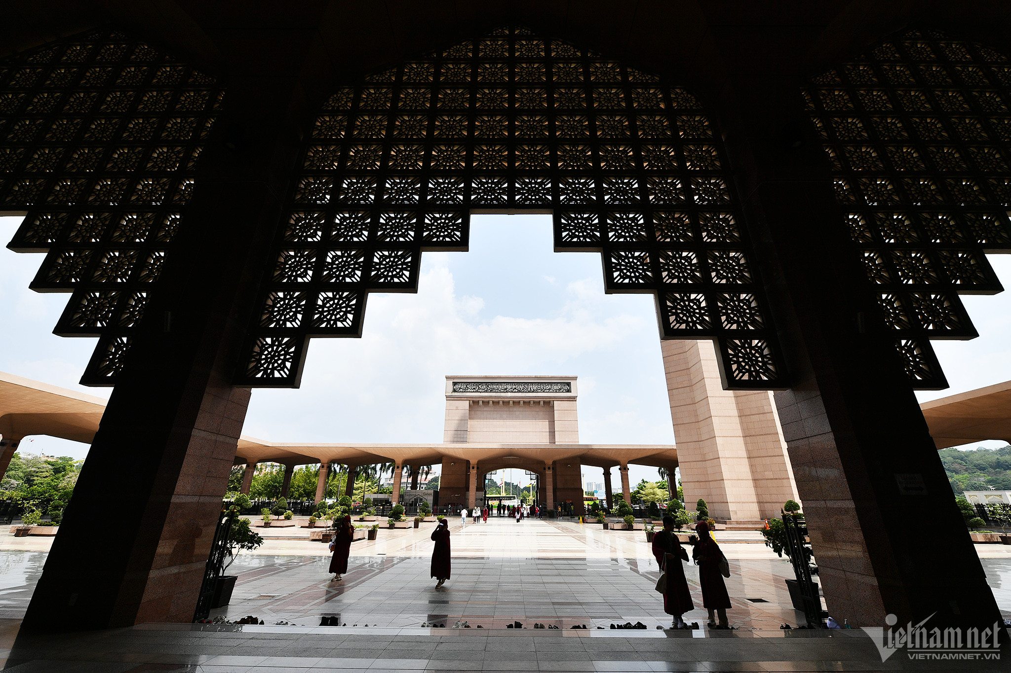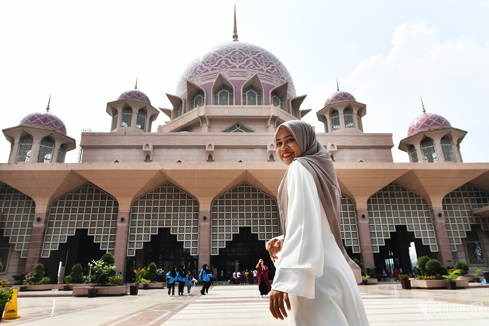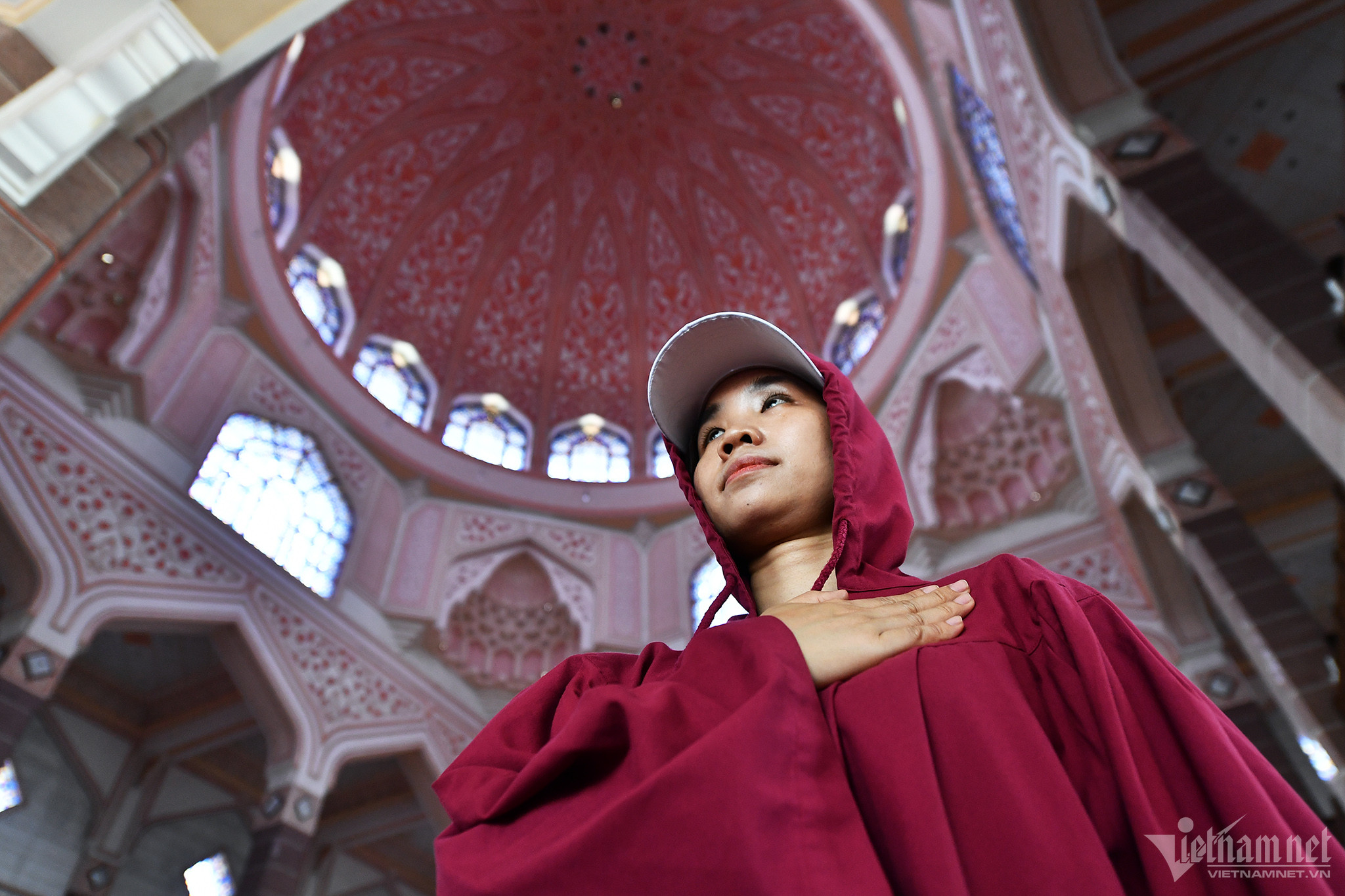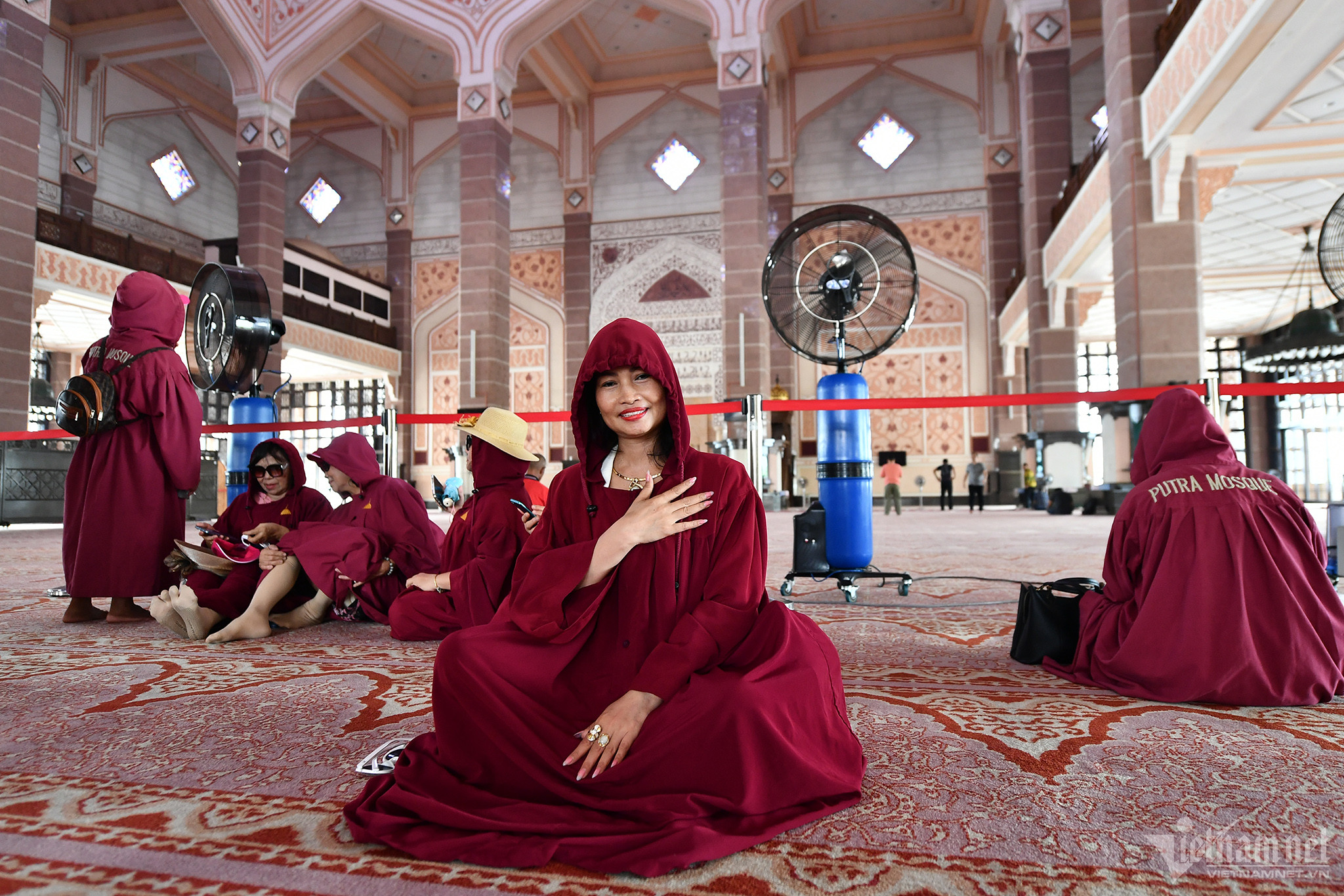 Chị Hà (trái), một người Việt Nam lần đầu được tham quan Thánh đường màu hồng. "Tôi đọc báo và biết nhiều về nhà thờ Hồi giáo này, hôm nay mới được tận mắt chiêm ngưỡng. Tôi thấy nó khá độc đáo", nữ du khách nói.