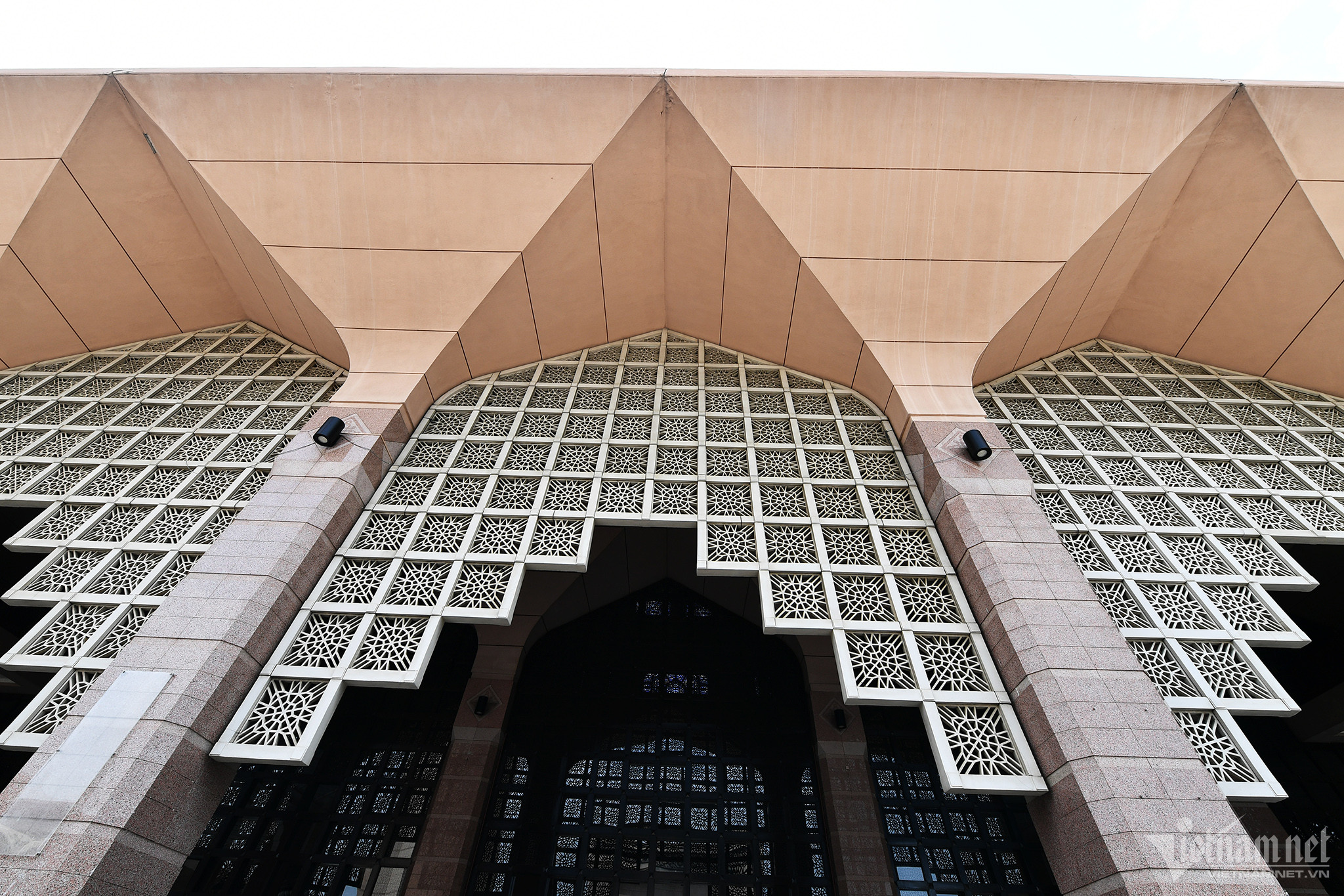 Công trình cao 75m, ngọn tháp 5 tầng cao 116m, sức chứa lên đến 15.000 người cầu nguyện cùng một lúc, mang đậm dấu ấn giao thoa văn hóa Mã Lai. Tất cả được xây dựng bằng đá granite, các nguyên liệu đều có sắc hồng nổi bật.