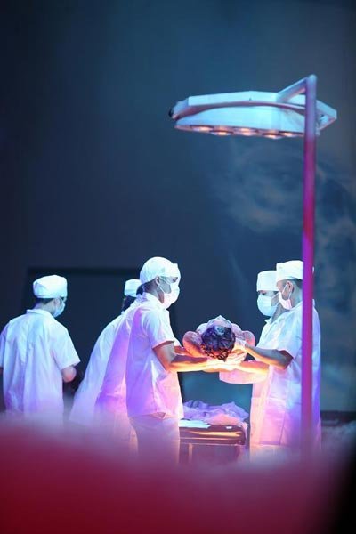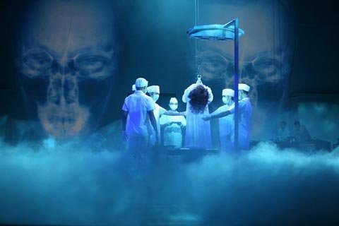 Màn trình diễn mang màu sắc kinh dị bắt đầu bằng sợi cáp thả rơi Thanh Hằng từ trên cao xuống chiếc bàn mổ.