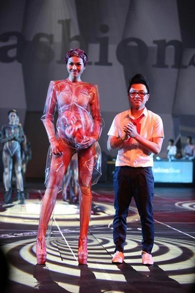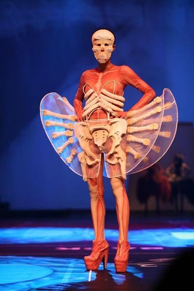 - Trong bộ đồ da vẽ các cơ xương, siêu mẫu Thanh Hằng hóa thành một tử thi diễn thời trang trên sàn diễn của đêm thời trang Đẹp Fashion Show 10.
