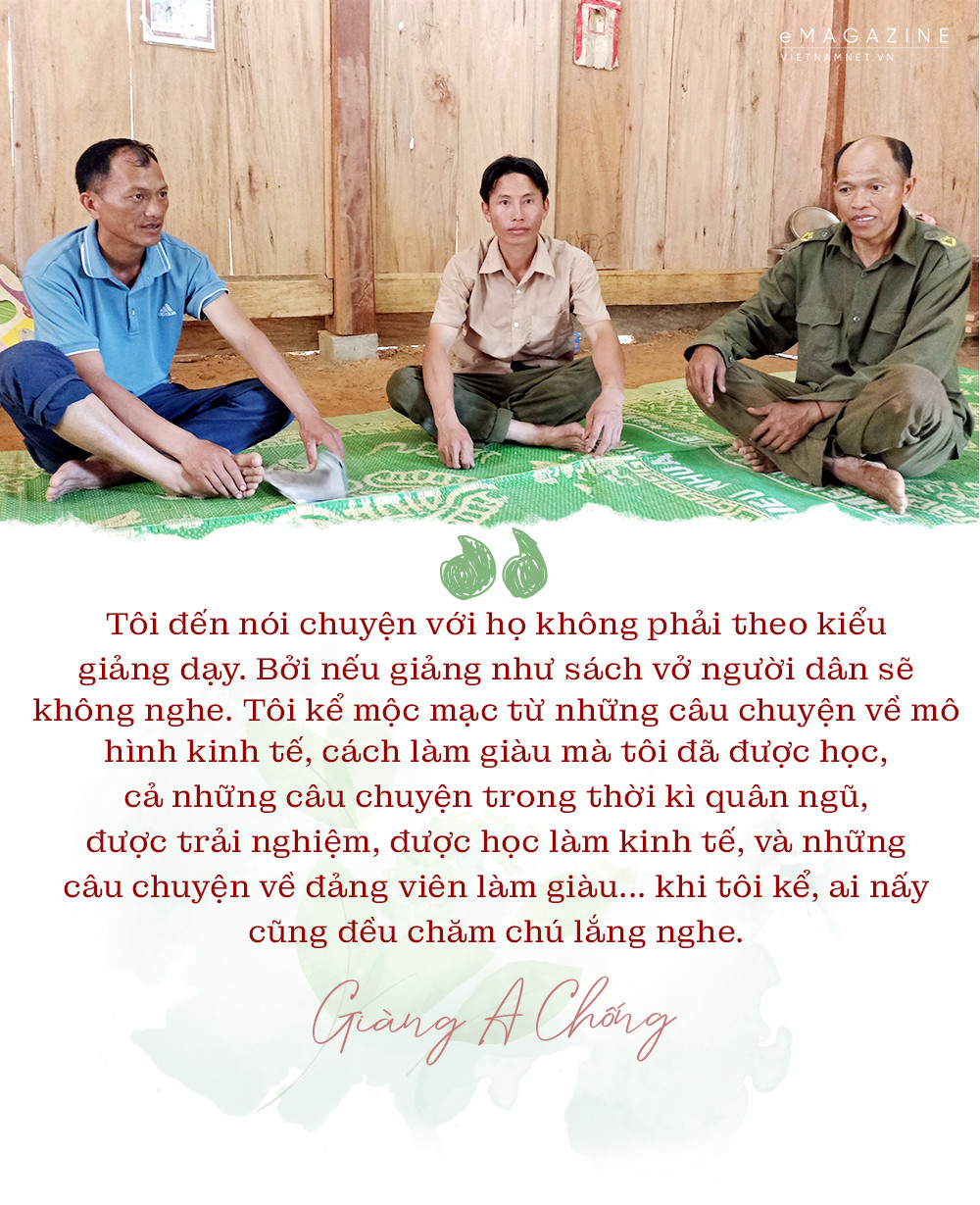 “Tôi đến nói chuyện với họ không phải theo kiểu giảng dạy. Bởi nếu giảng như sách vở người dân sẽ không nghe. Tôi kể mộc mạc từ những câu chuyện về mô hình kinh tế, cách làm giàu mà tôi đã được học, cả những câu chuyện trong thời kỳ quân ngũ, được trải nghiệm, được học làm kinh tế, và những câu chuyện về đảng viên làm giàu… khi tôi kể, ai nấy cũng đều chăm chú lắng nghe”, anh Chống nhớ lại.