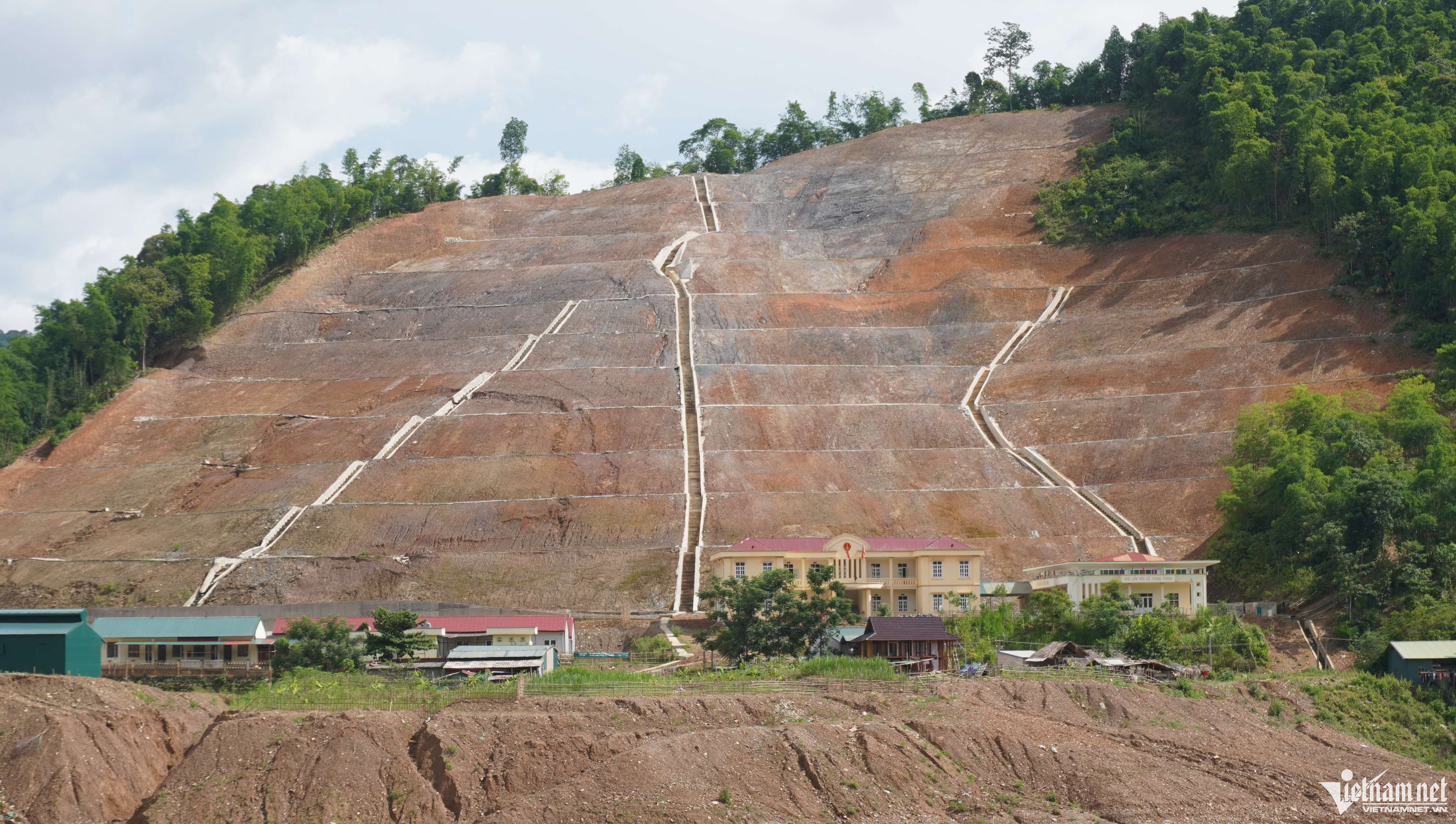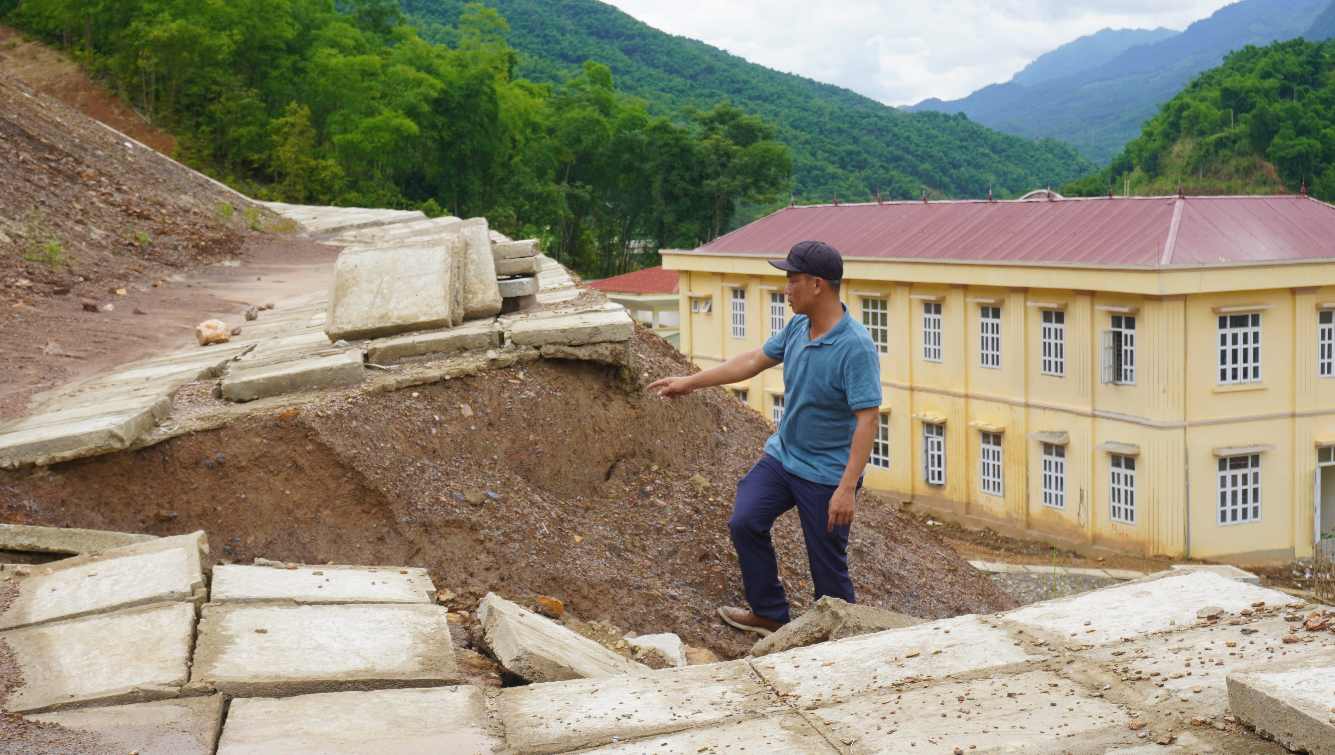 Tuy nhiên, công trình vừa mới hoàn thành đã đứt gãy, nứt toác nghiêm trọng, xuất hiện các cung trượt và có thể nguy cơ vùi lấp trường học và công sở bất cứ lúc nào trước mùa mưa bão.
