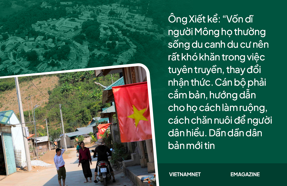 Ông Xiết kể: “Vốn dĩ người Mông họ thường sống du canh du cư nên rất khó khăn trong việc tuyên truyền, thay đổi nhận thức. Cán bộ phải cắm bản, hướng dẫn cho họ cách làm ruộng, cách chăn nuôi để người dân hiểu. Dần dần dân bản mới tin”.