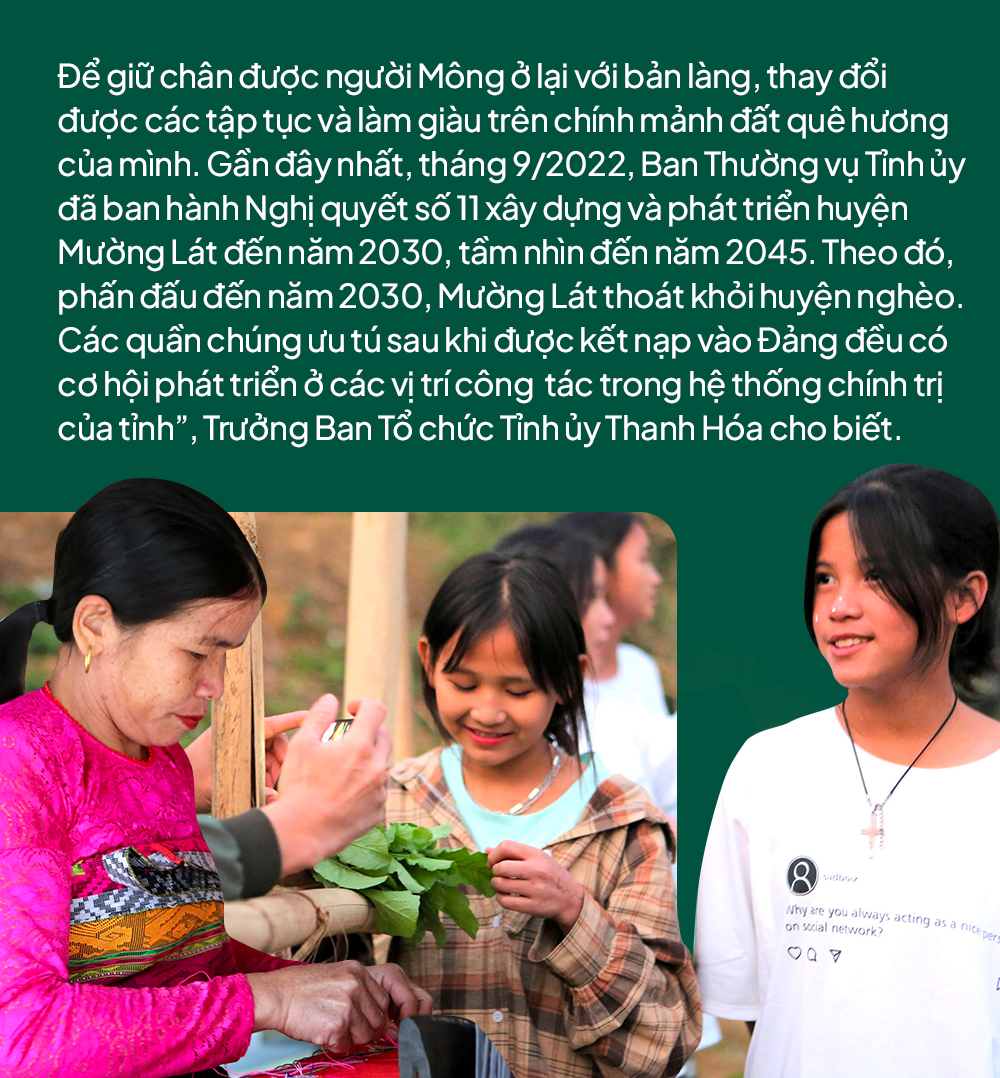 “Để giữ chân được người Mông ở lại với bản làng, thay đổi được các tập tục và làm giàu trên chính mảnh đất quê hương của mình. Gần đây nhất, tháng 9/2022, Ban Thường vụ Tỉnh ủy đã ban hành Nghị quyết số 11 xây dựng và phát triển huyện Mường Lát đến năm 2030, tầm nhìn đến năm 2045.