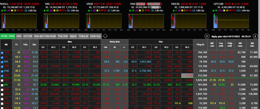Mở cửa phiên giao dịch 4/11, phần lớn cổ phiếu trên sàn chứng khoán Việt Nam giảm điểm. Trong nhóm cổ phiếu trụ cột VN30, có 29 trên tổng cộng 30 mã giảm giá; trong đó có Novaland của cựu chủ tịch Bùi Thành Nhơn và PDR của Chủ tịch Nguyễn Văn Đạt giảm sàn ngay từ đầu phiên và có dư mua bằng 0.