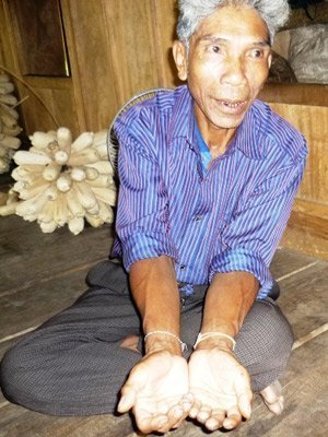 | Ông Hồ Thoong ở bản Hà Vi, đang kể lại lần được "thầy" Poom làm lễ buộc tay trừ tà. |